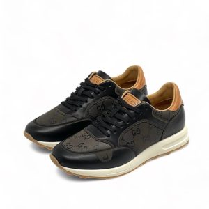 GUCCI кроссовки черная кожа серый текстиль коричневая пятка