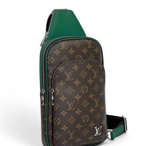 LV Слинг коричневая монограмма с вставками из зеленой гладкой кожи большой карман спереди и железное лого
