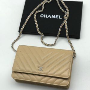 CHANEL сумка Woc гладкая кожа в полоску бежевая фурнитура серебро