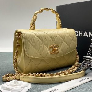 CHANEL сумка с клапаном и золотой металлической ручкой в клетку желтая гладкая кожа