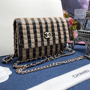CHANEL мини-сумка с клапаном из соломенного текстиля в полоску бежево-черную с клапаном