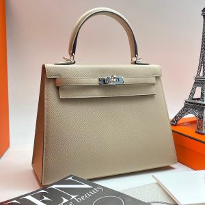 HERMES сумка Kelly кожа Эпсом 25 см светло-бежевая ручная фурнитура серебро