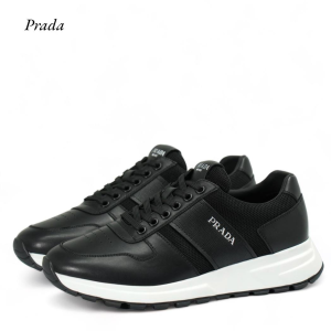 PRADA кроссовки черные кожа с перфорацией на белой подошве