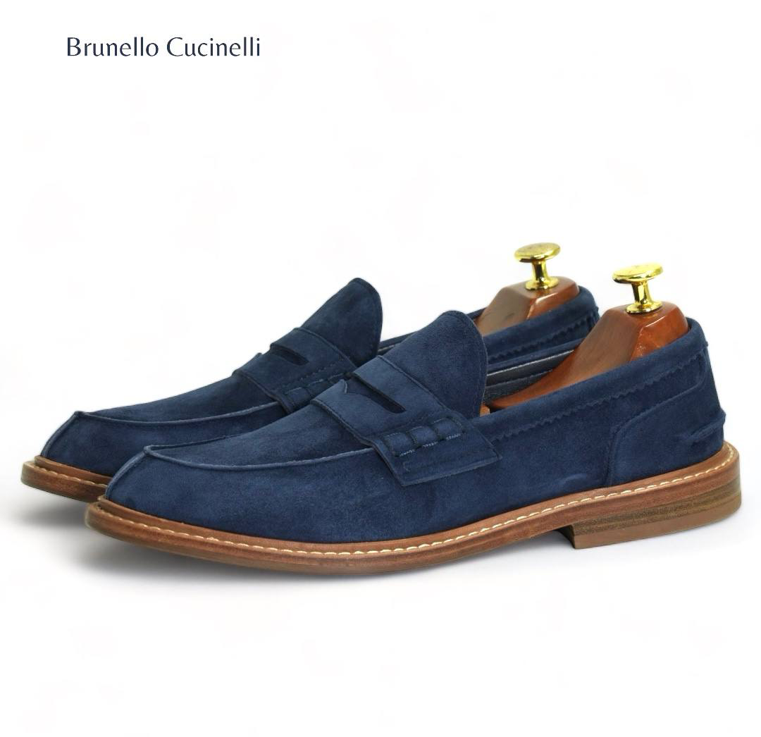 BRUNELLO лоферы замша темно-синие коричневая твердая классическая подошва