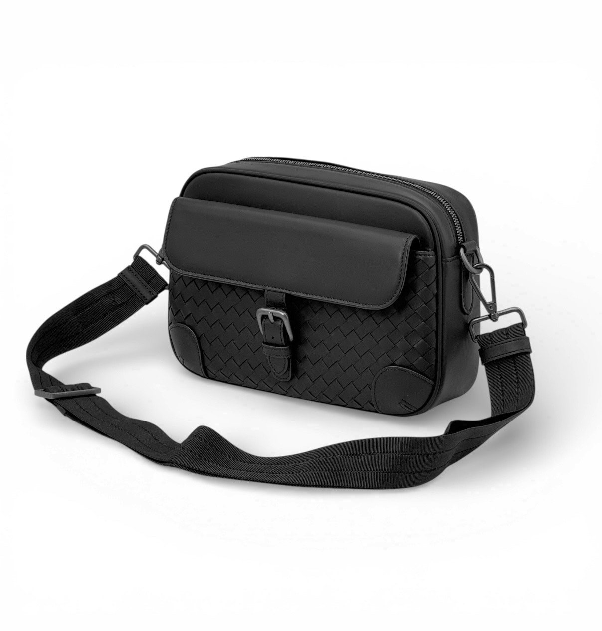 BV мессенджер комбинированная гладкая черная кожа с плетением на молнии и доп карманом с переди