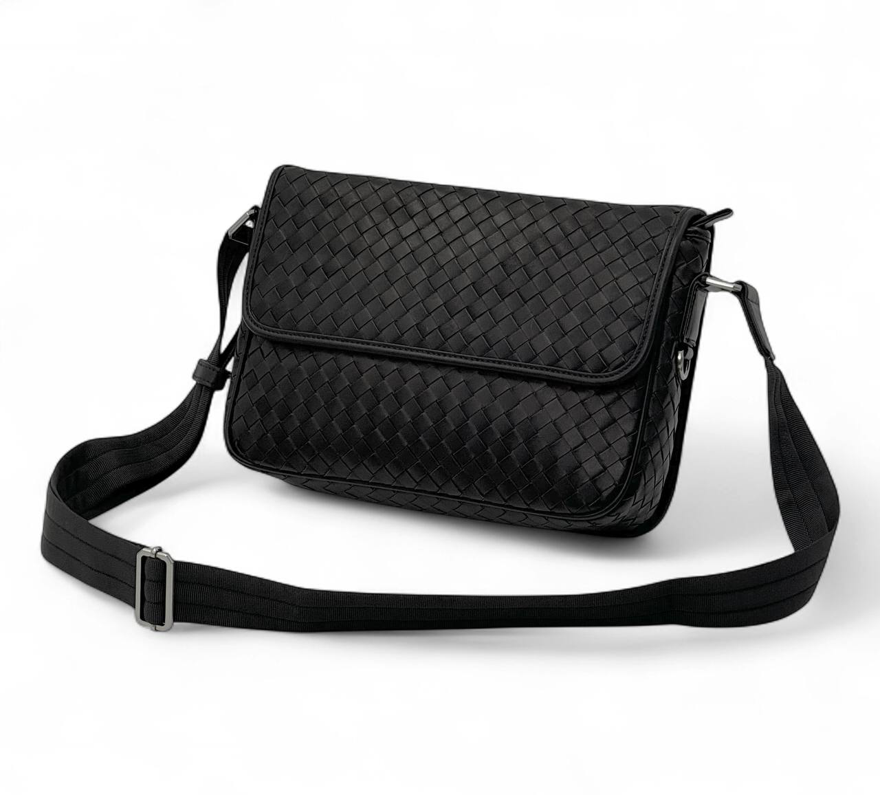 BV мессенджер мелкое плетение черная кожа теленка с клапаном