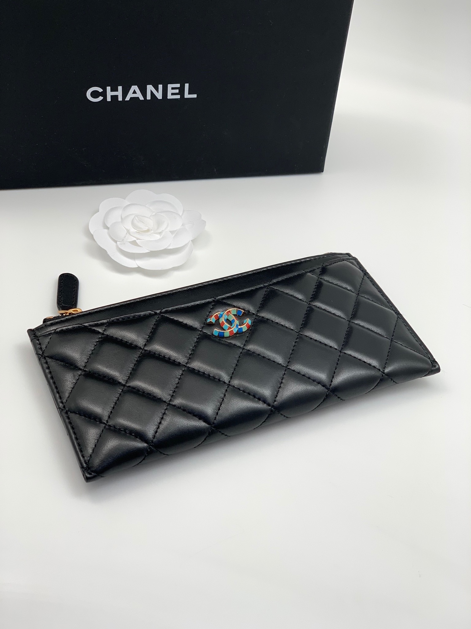 CHANEL кошелек на молнии тонкий гладкая кожа в клетку черный