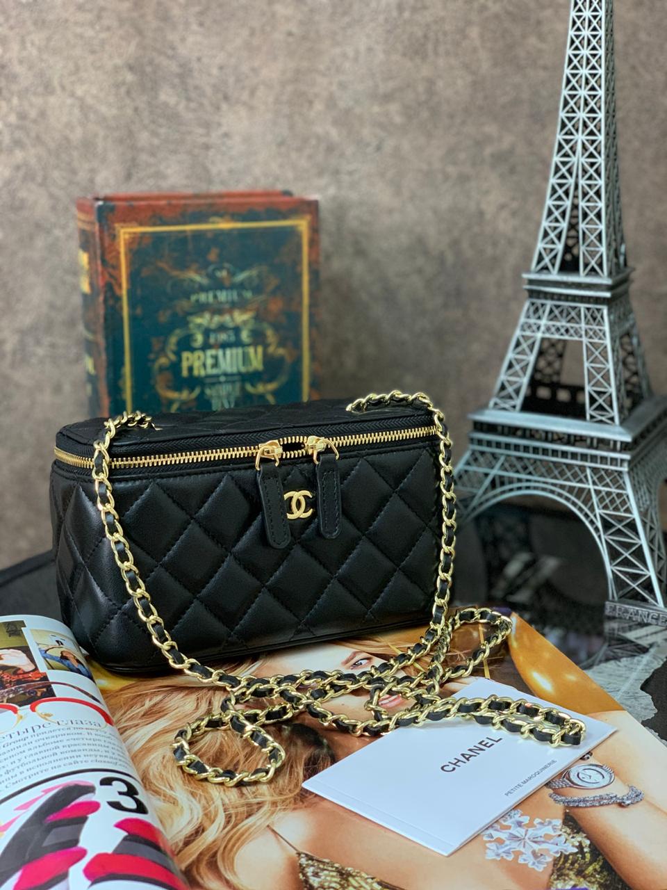 CHANEL мини-сумка чехол для телефона в клетку черная с клапаном гладкая кожа