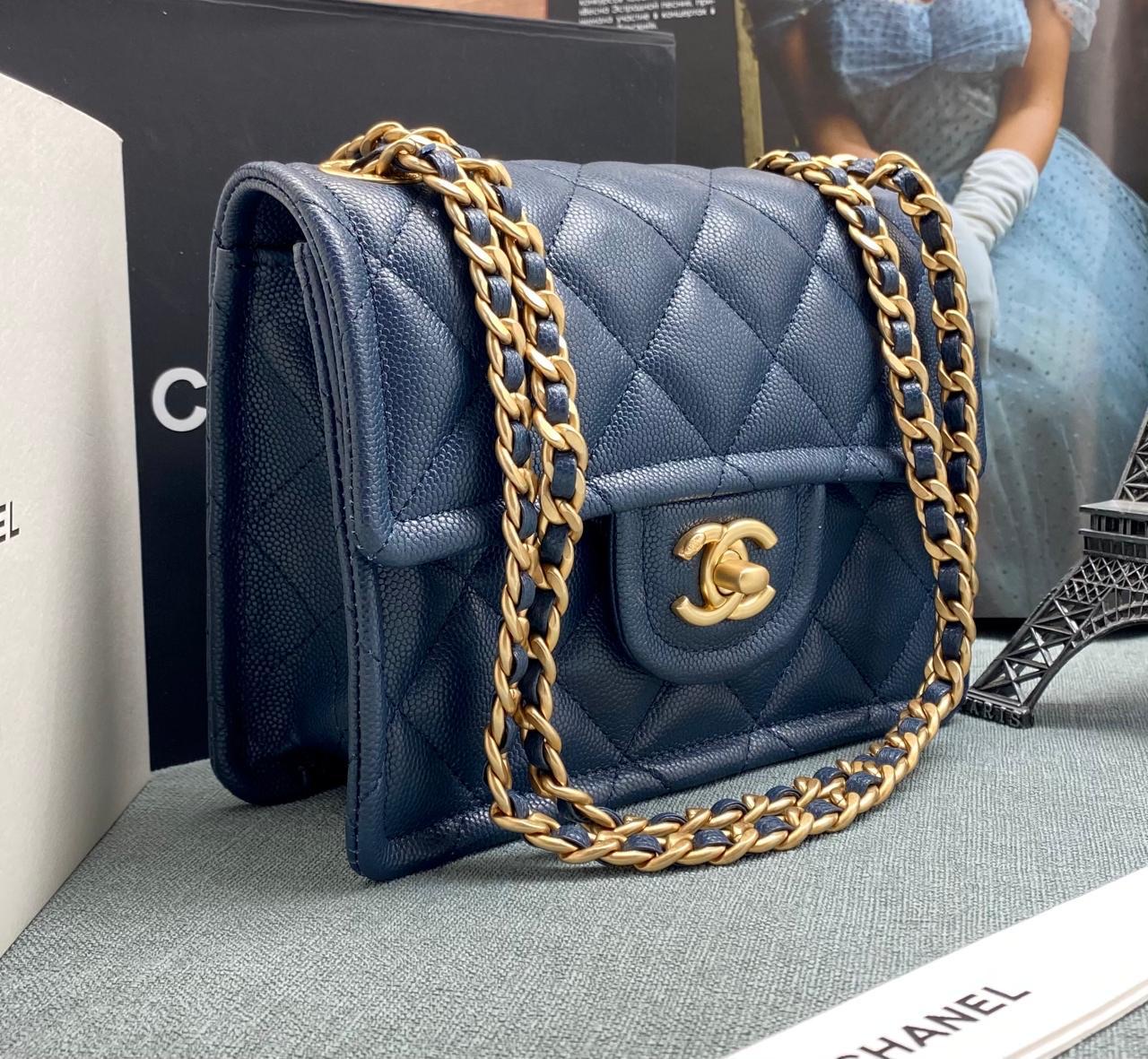 CHANEL мини-сумка конверт синяя кожа Caviar в клетку фурнитура золото