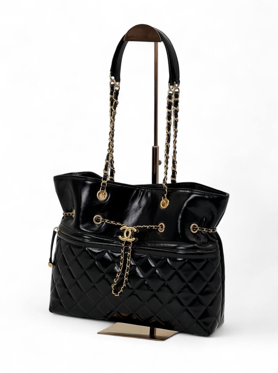 CHANEL сумка-мешок из гладкой черной кожи с широкой ручкой цепью фурнитура золото