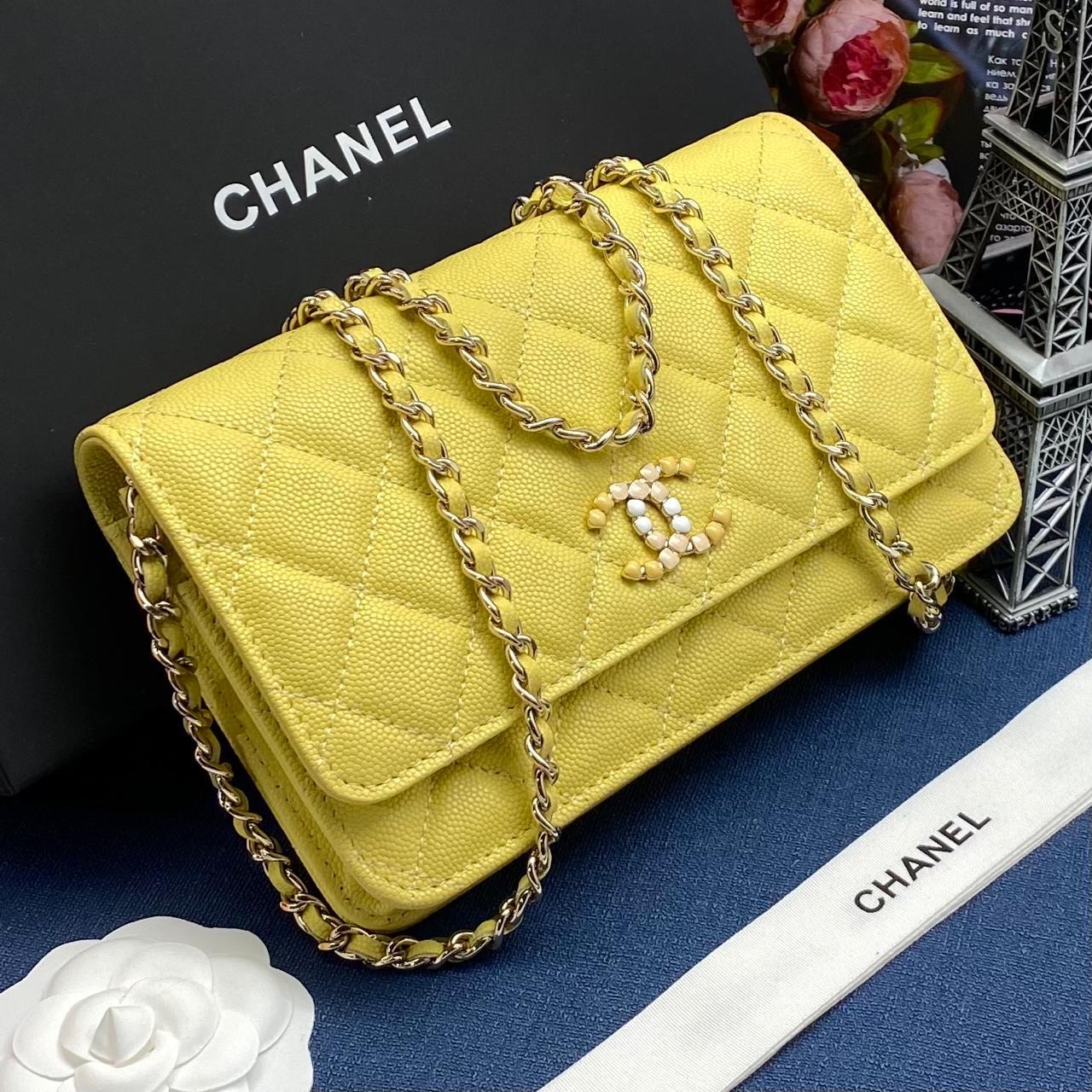 CHANEL сумка Woc кожа Caviar в клетку желтая фурнитура золото c камнями в цвет