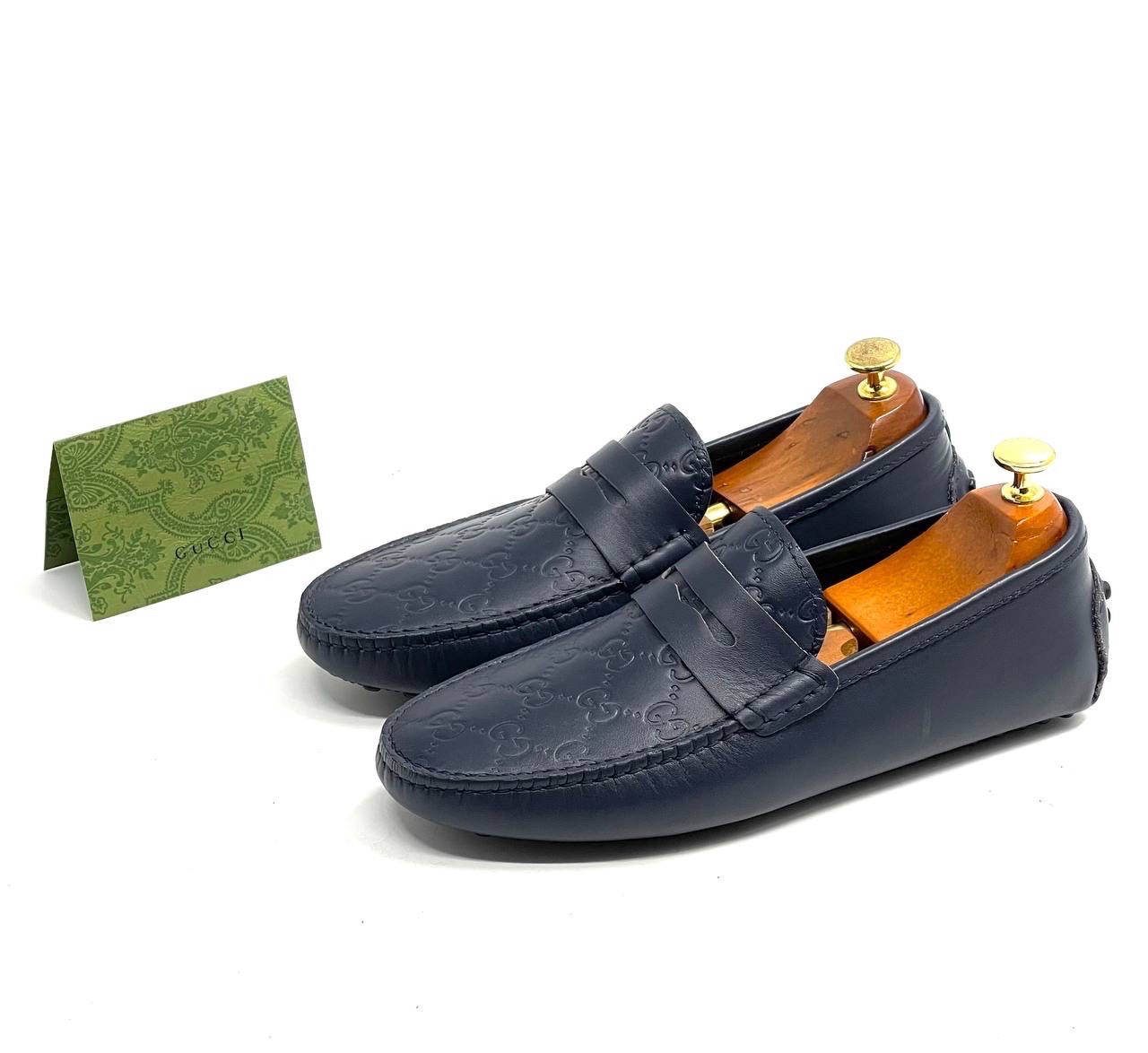 GUCCI лоферы из синей кожи в монограмму с перемычкой