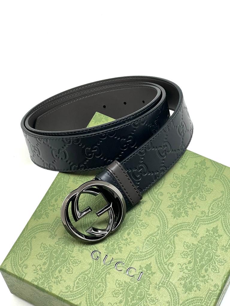 GUCCI ремень двухсторонний тиснение монограмма и гладкая кожа черный пряжка GG остроугольная черная