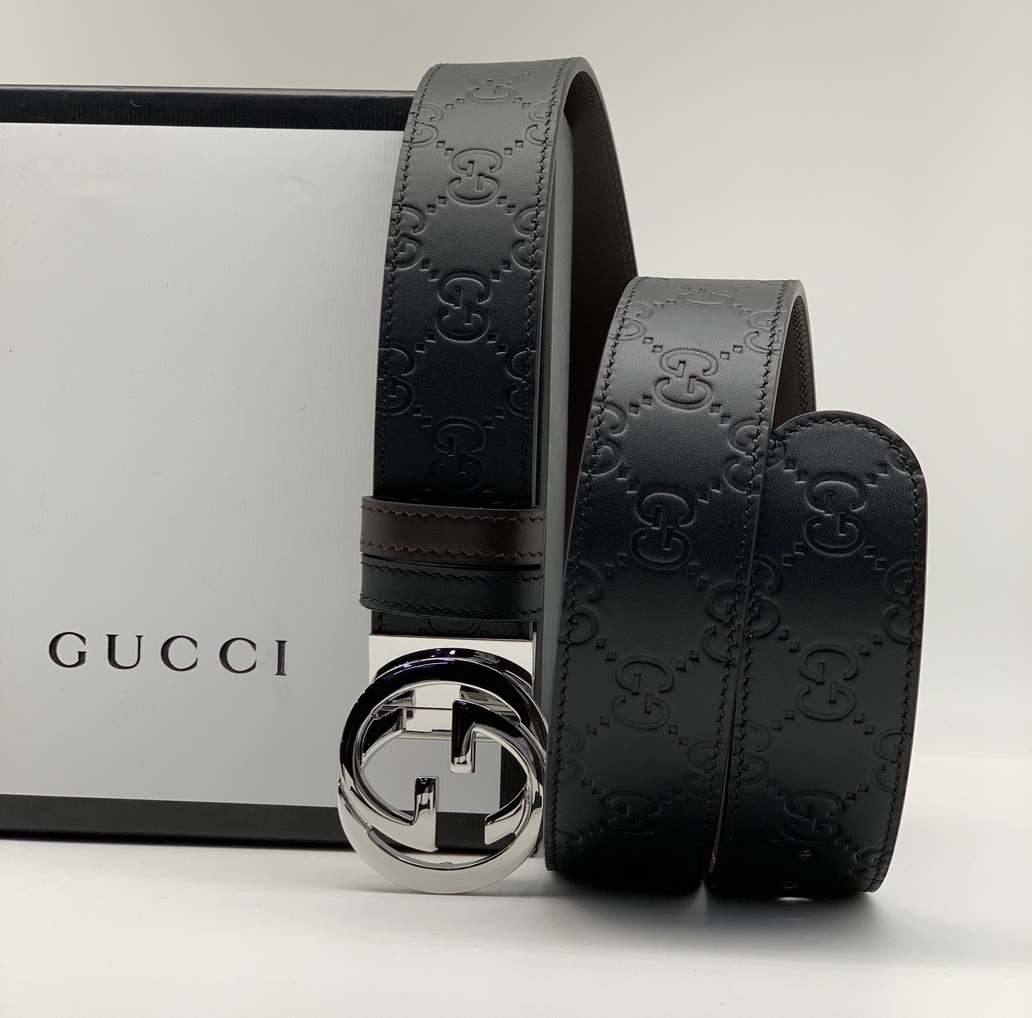 GUCCI ремень кожа монограмма черный гладкий пряжка круглая лого плоская