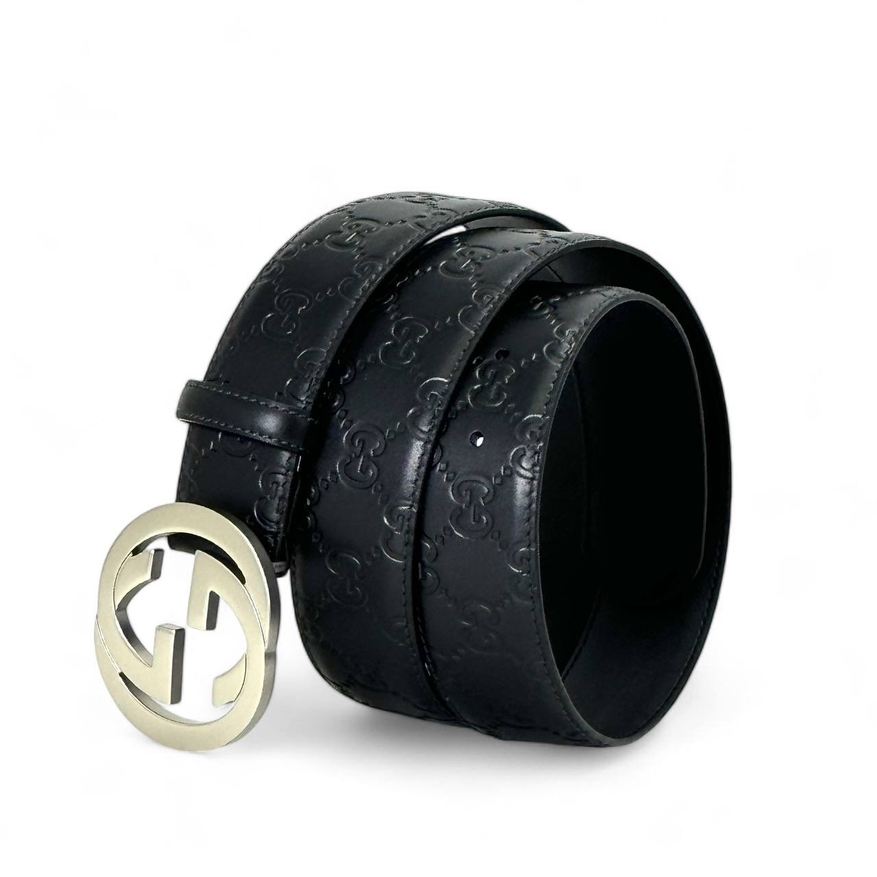 GUCCI ремень кожа монограмма черный пряжка GG серебро матовая