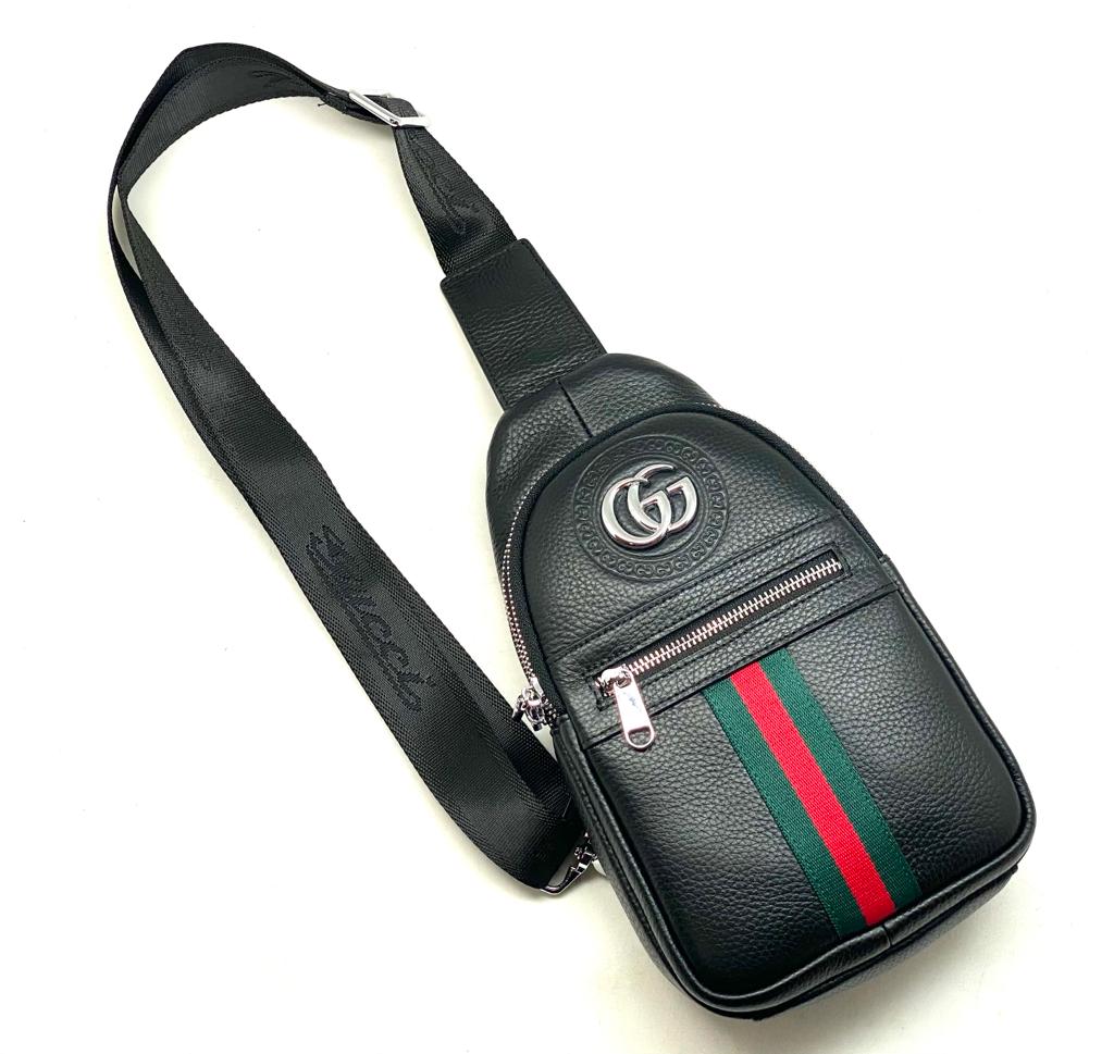 GUCCI слинг черный кожа того красно-зеленая полоса и большой логотип серебро