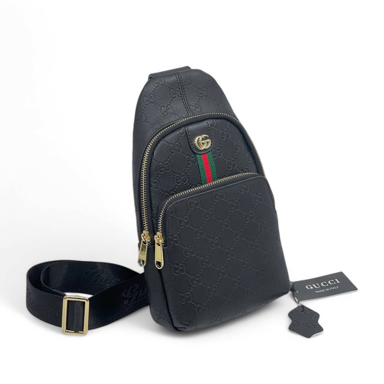 GUCCI слинг кожа тисненная в монограмму черная с текстильно красно зеленой полоской по центру