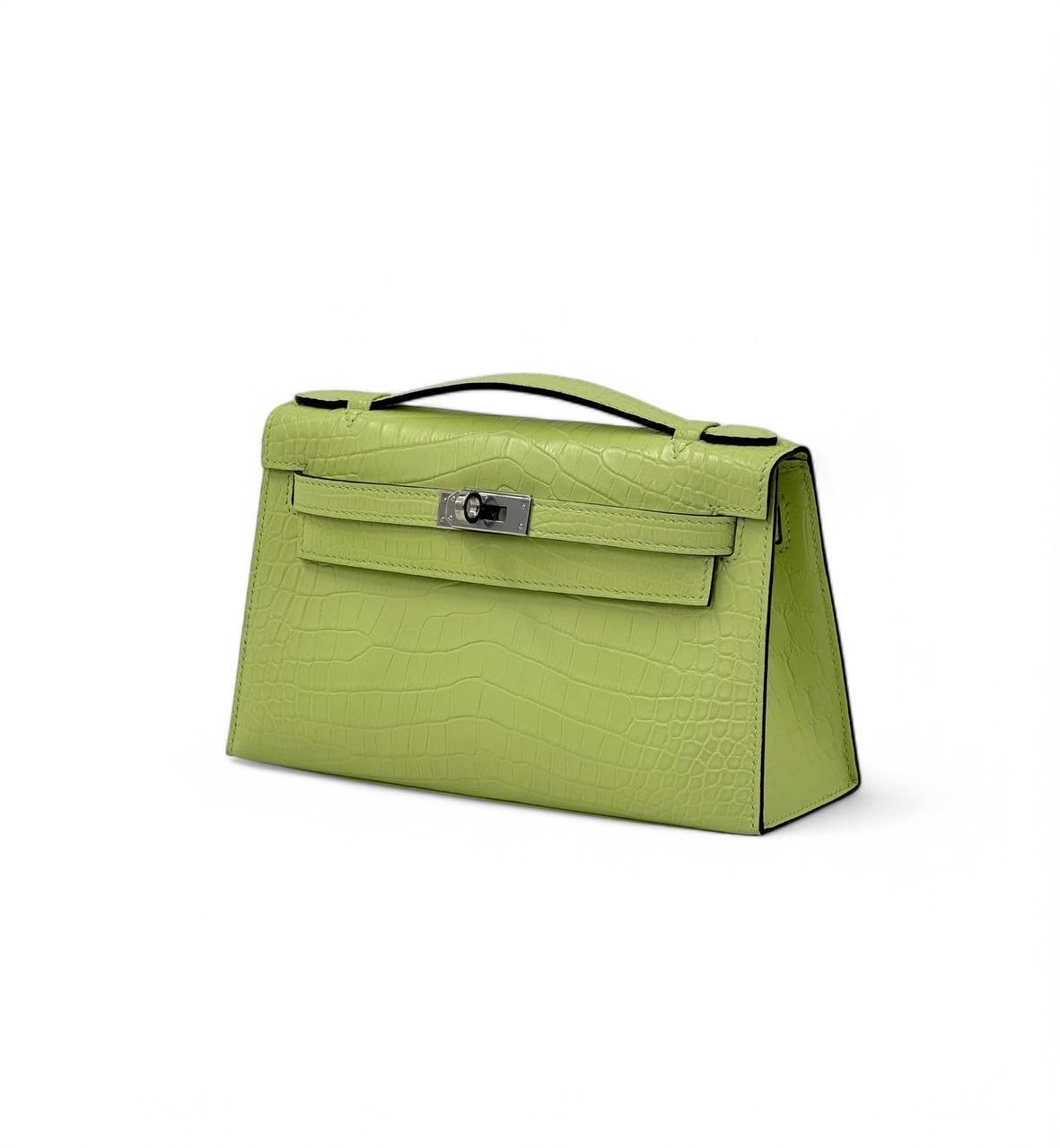 HERMES клатч POCHETTE 22 см салатовая кожа крокодила серебро