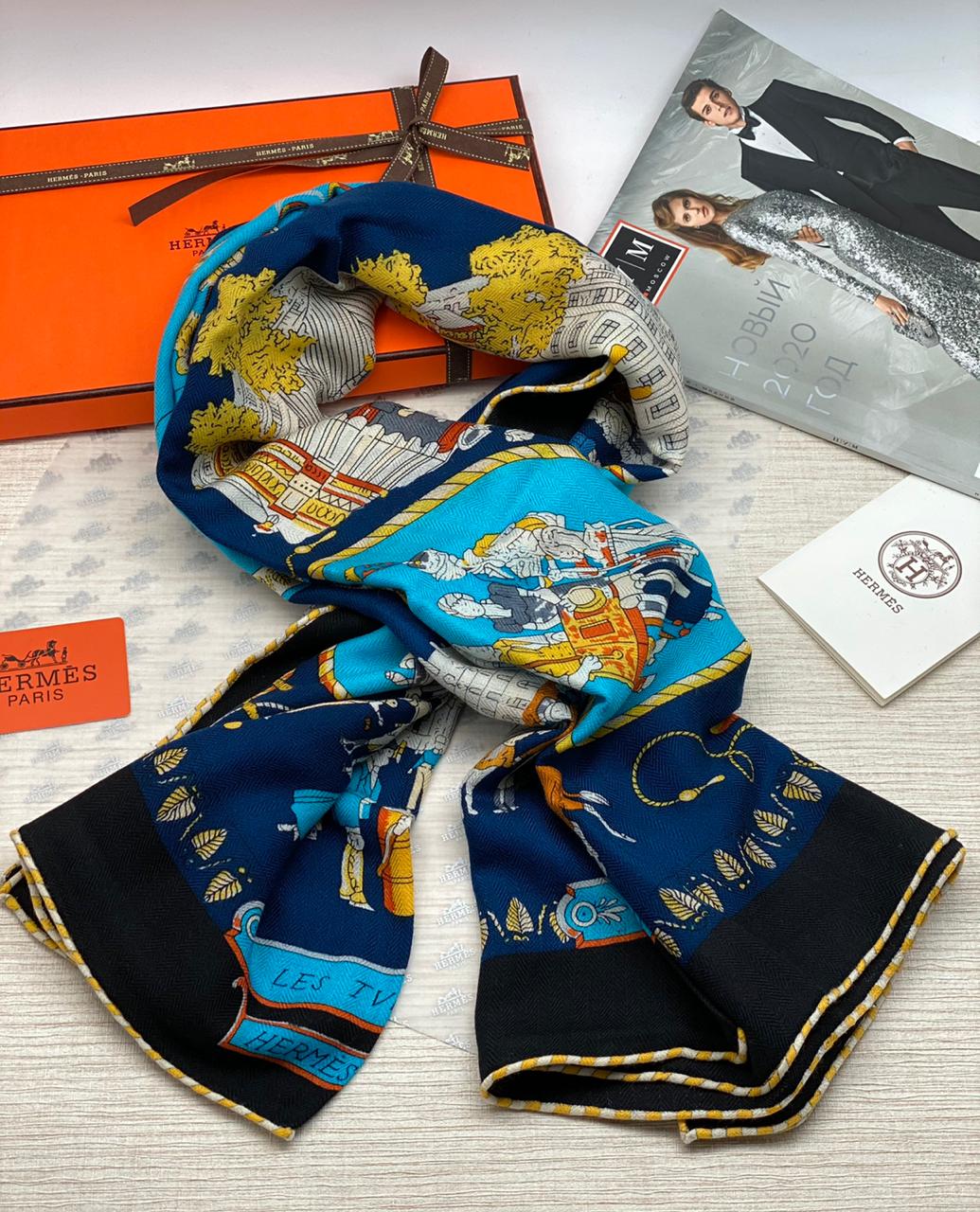 HERMES платок черно-сине-голубой с иллюстрацией, черной линией по краю и желто-белой окантовкой