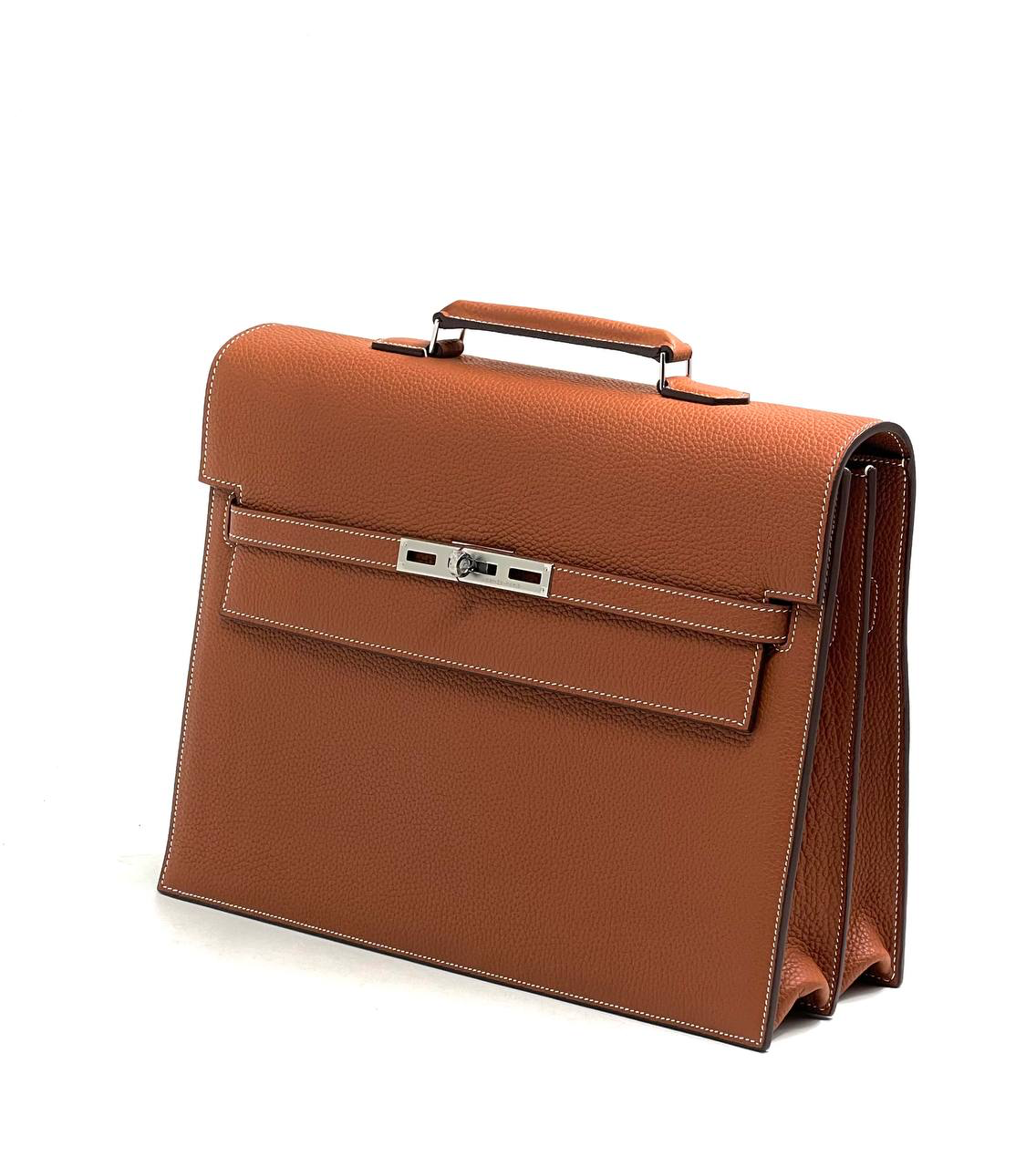 HERMES Портфель тогос белой строчкой КЭМЕЛ с клапаном с замком на двух лямках