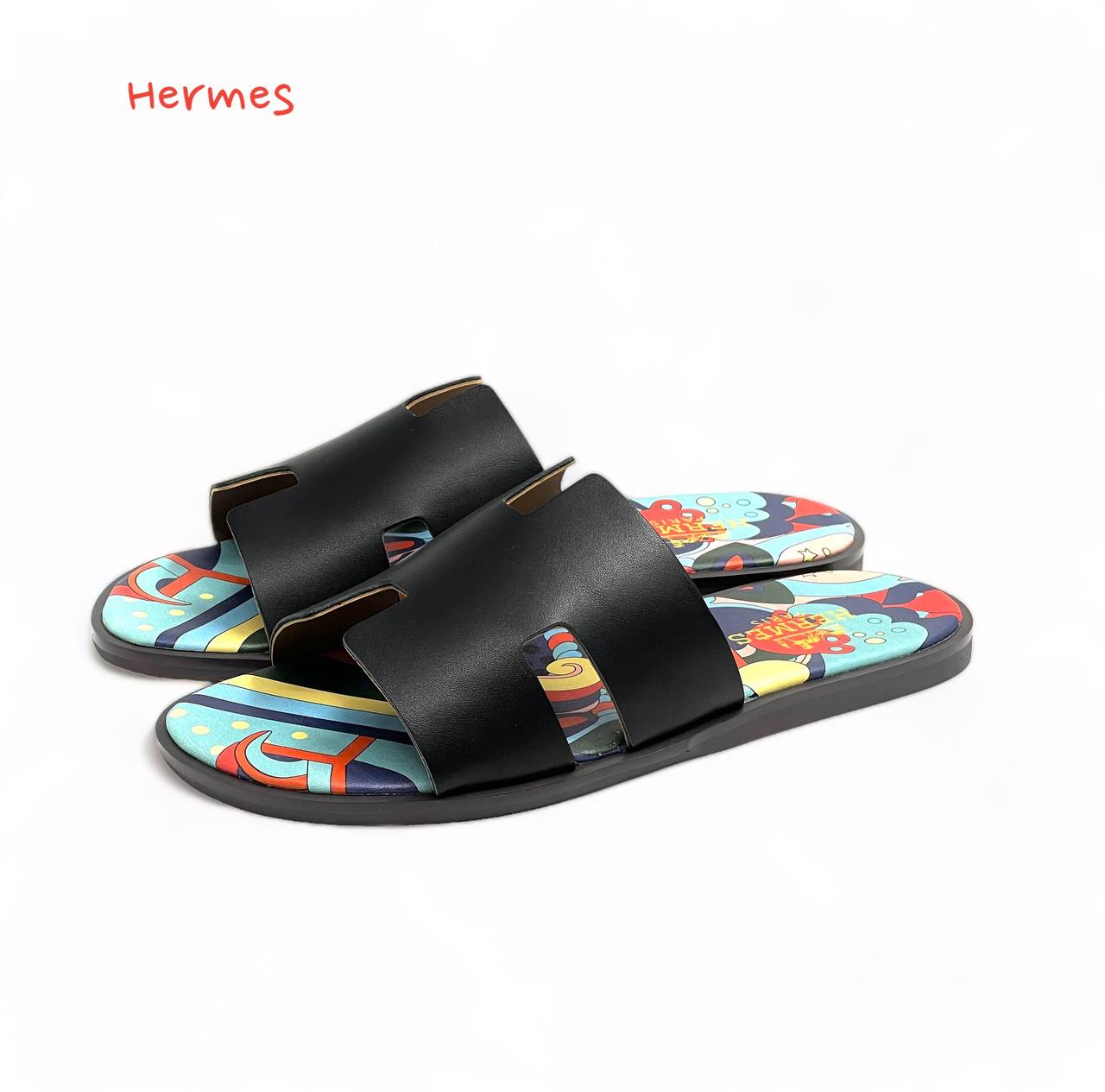 HERMES Тапочки черные гладкая кожа матовая с застежкой