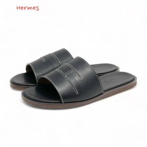 HERMES шлепанцы черные белая строчка кожаная подошва