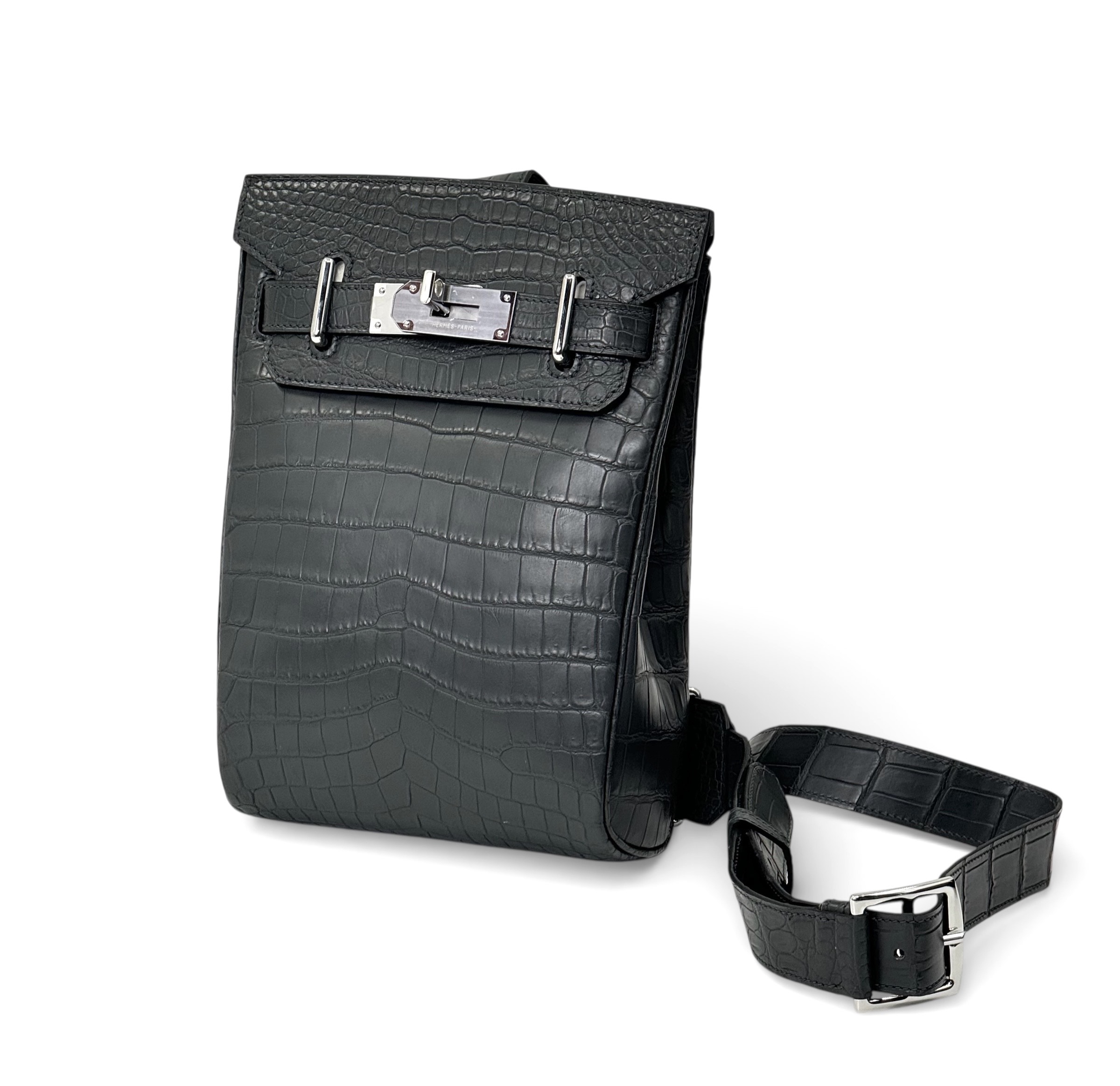 HERMES слинг графитого цвета из кожи крокодила с 2 хлястиками и фирменным замком
