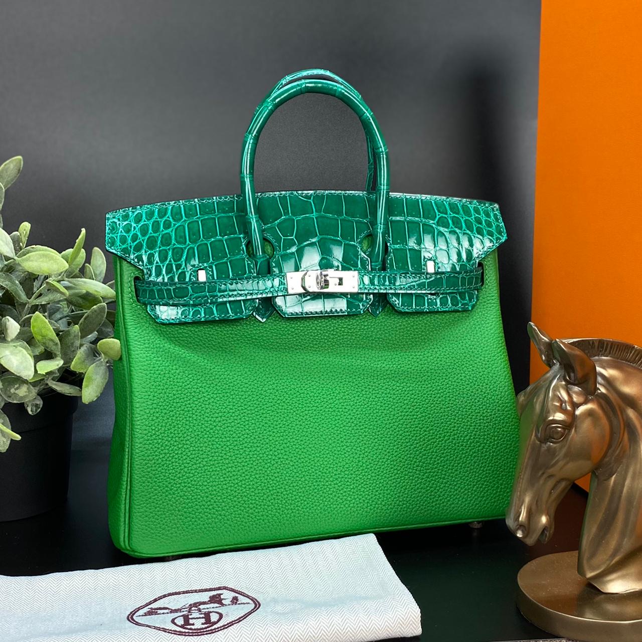 HERMES сумка BIRKIN 25 см зеленая кожа того и клапан из крокодила фурнитура серебро