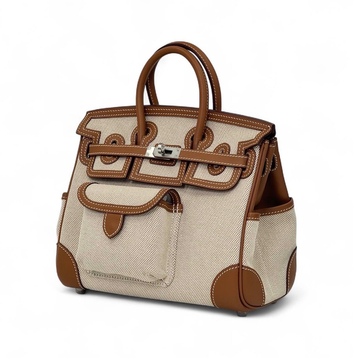 HERMES сумка Birkin Cargo 25 см текстиль бежевая с кожей кэмел серебро