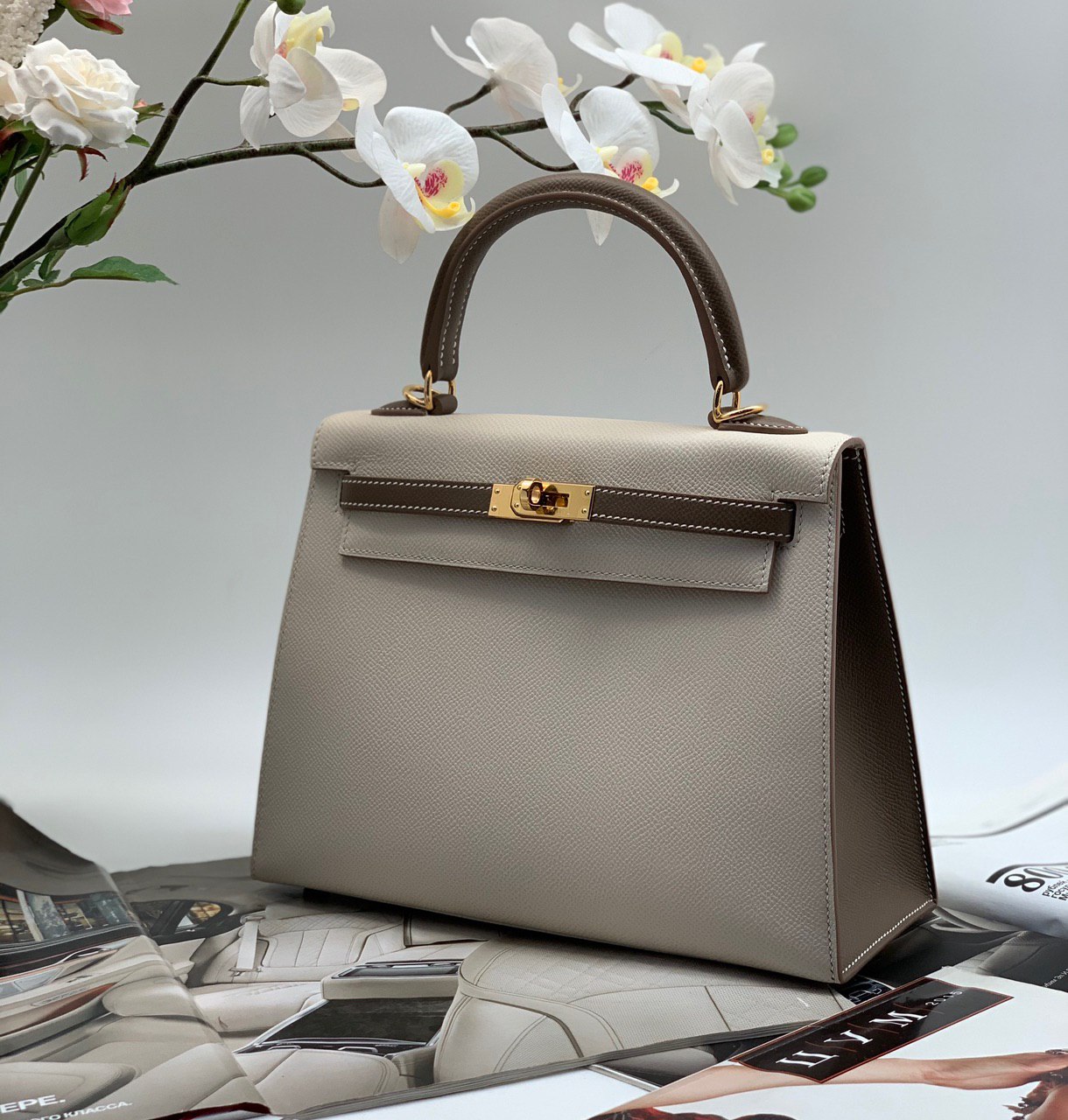 HERMES сумка Kelly кожа Эпсом 25 см светло-бежевая ручная фурнитура серебро