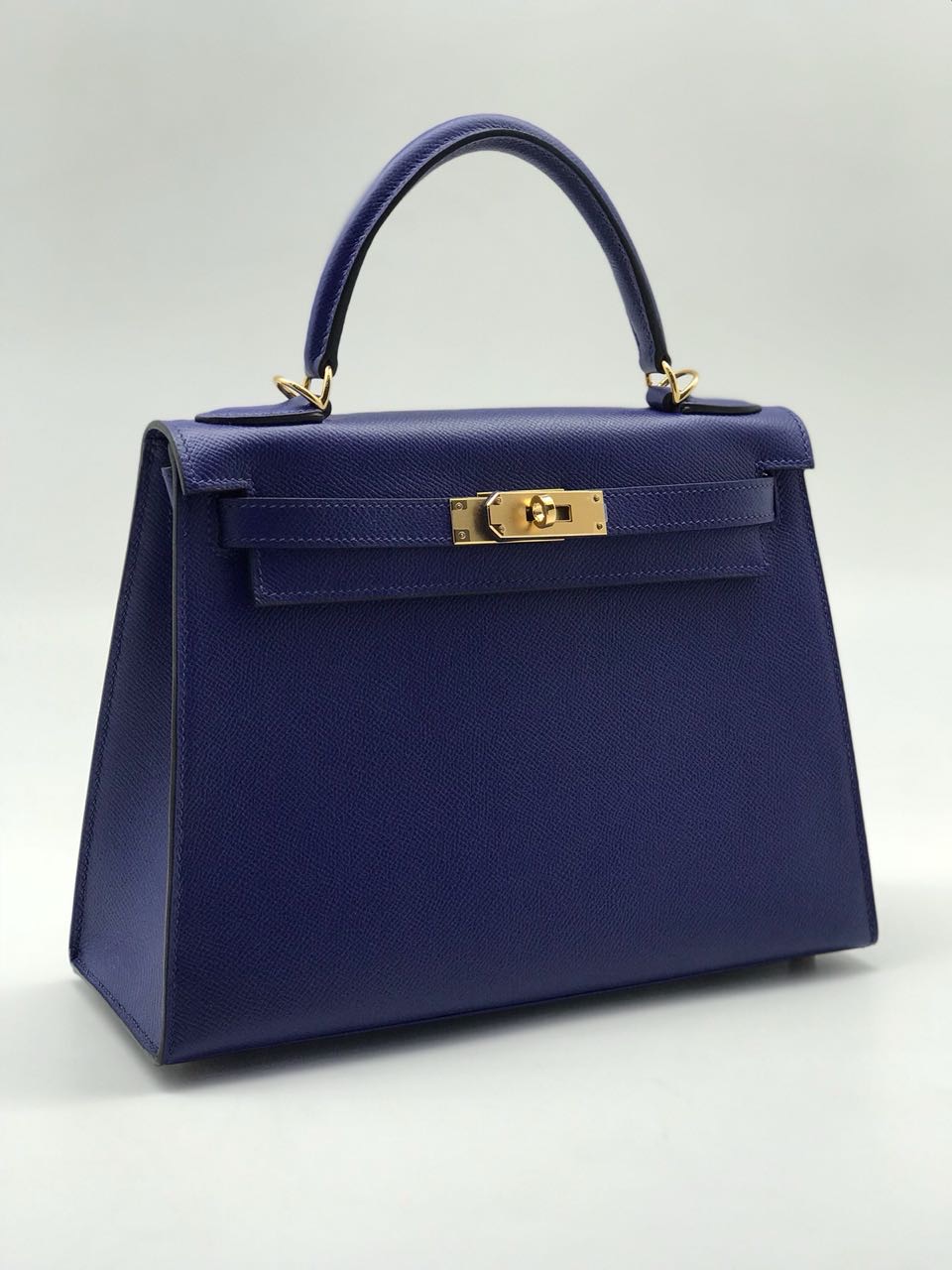 HERMES сумка Kelly кожа Эпсом 28 см синяя фурнитура золото