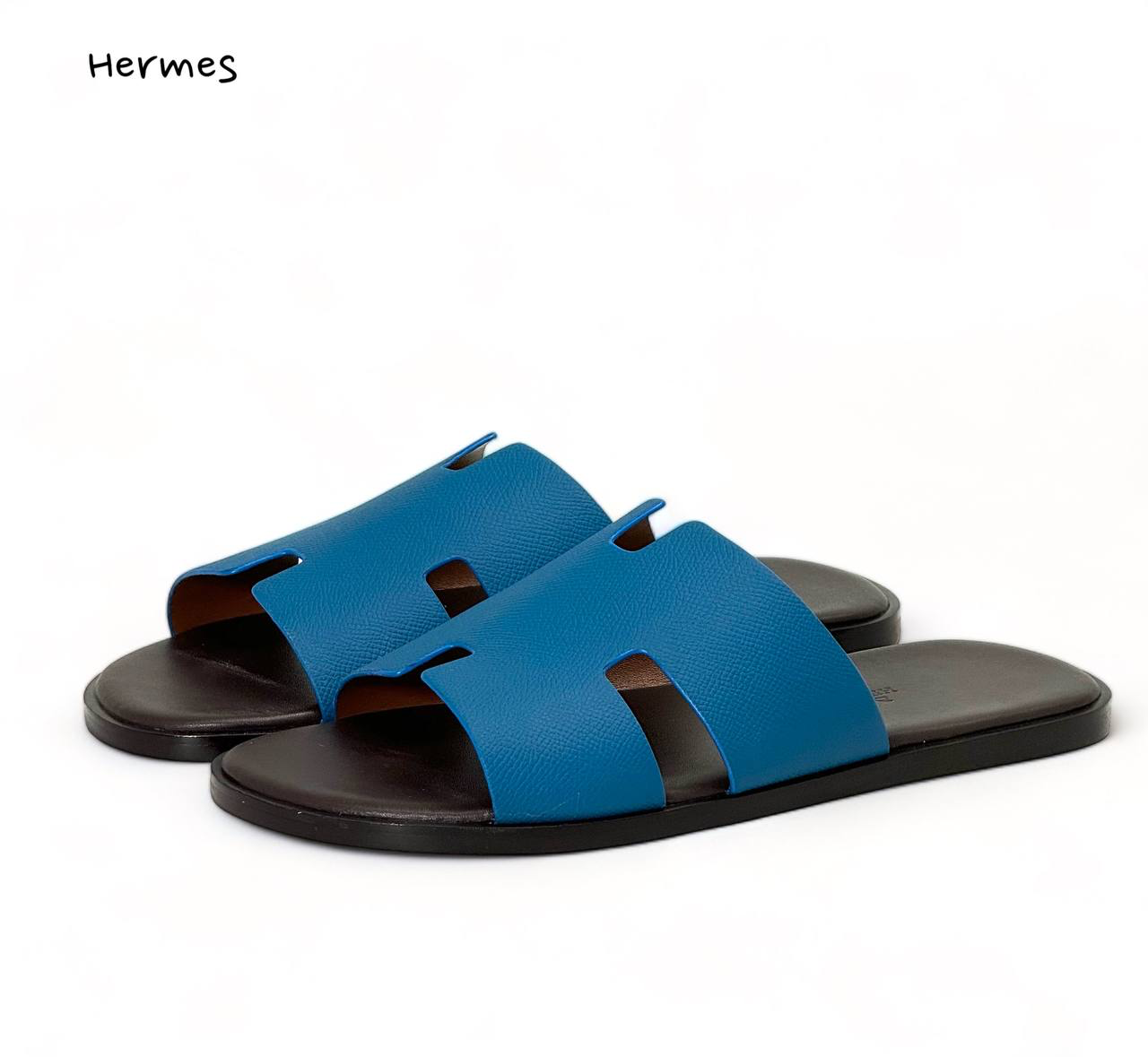 HERMES Тапочки из синей кожи эпсом серая стелька