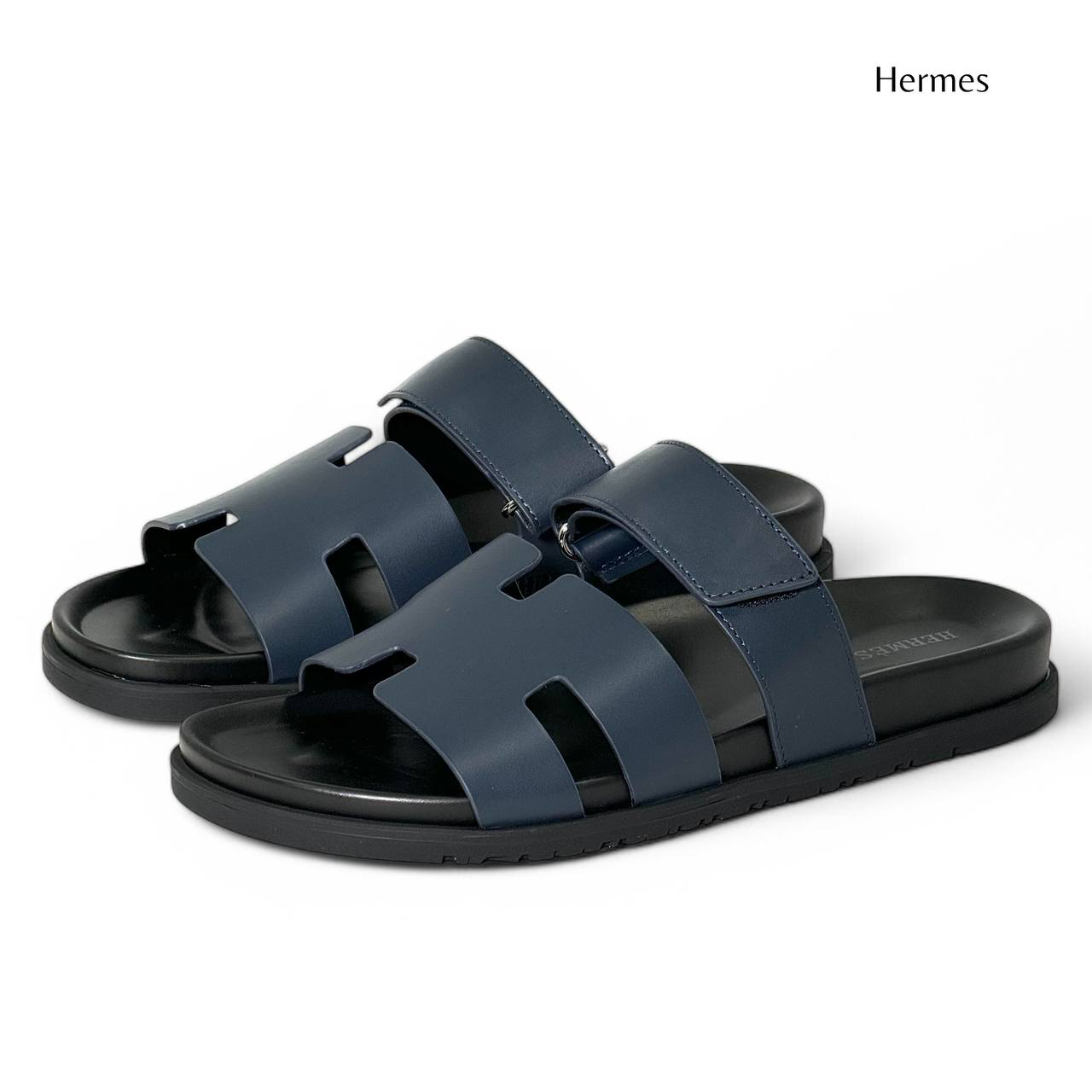 HERMES Тапочки из синей кожи эпсом серая стелька