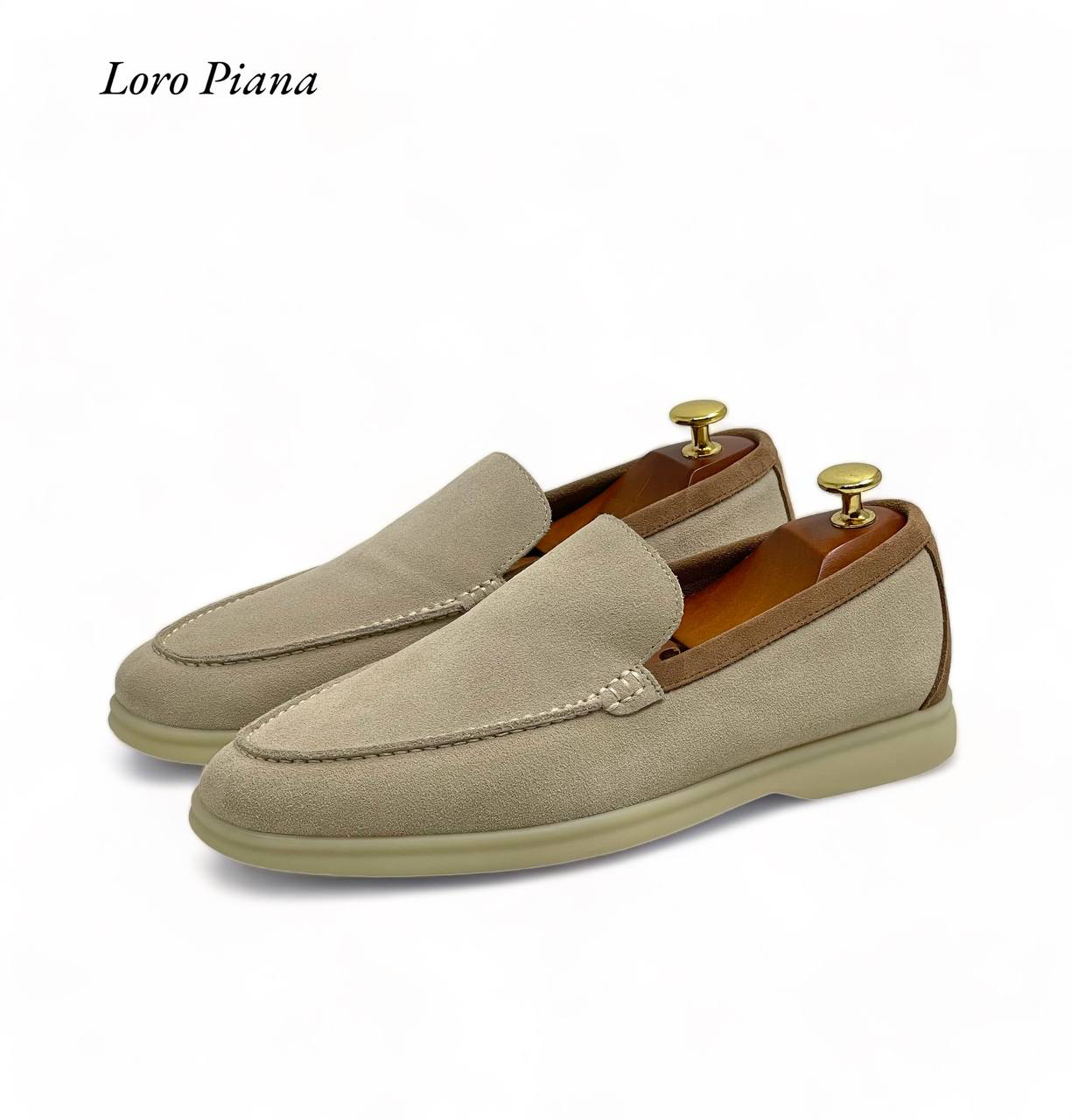 LORO PIANA лоферы низкие замша бежевые с коричневой вставкой