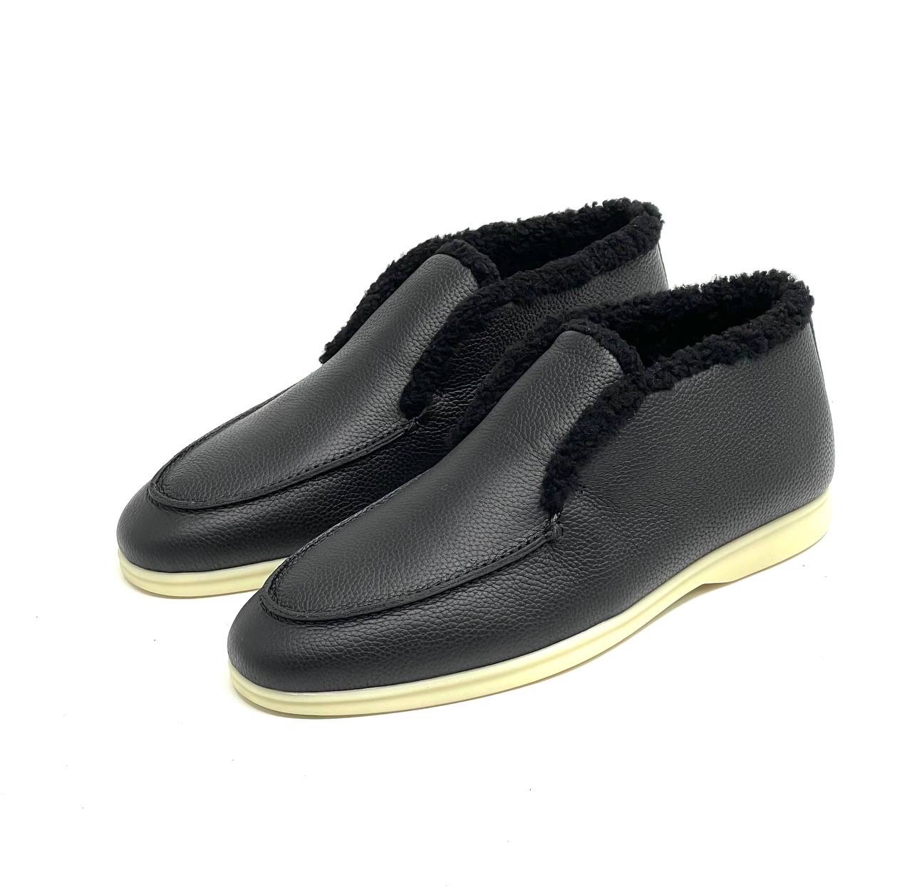LORO PIANA лоферы высокие с мехом наружу на белой подошве черная кожа