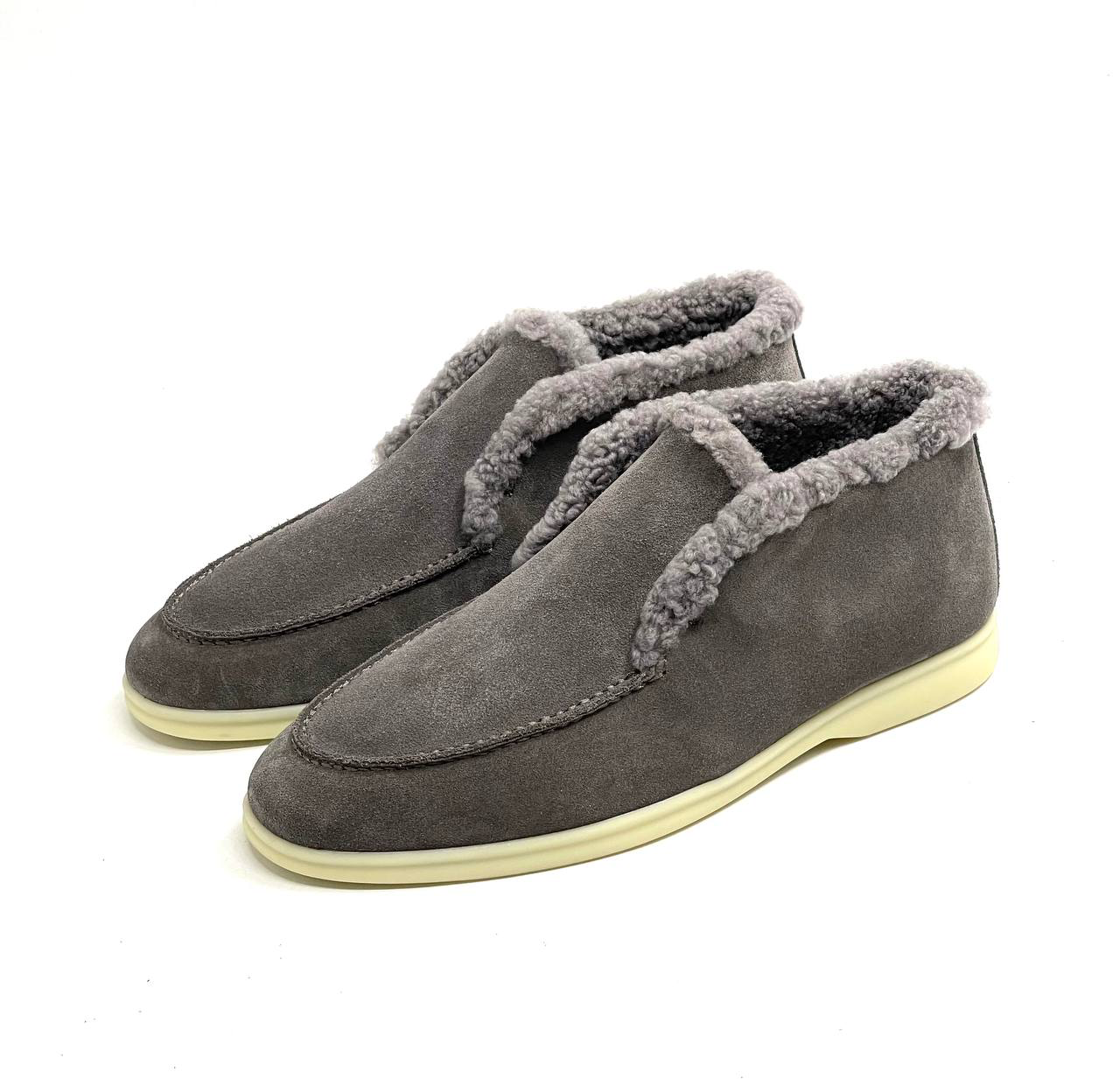 LORO PIANA лоферы высокие с мехом наружу на белой подошве серая замша