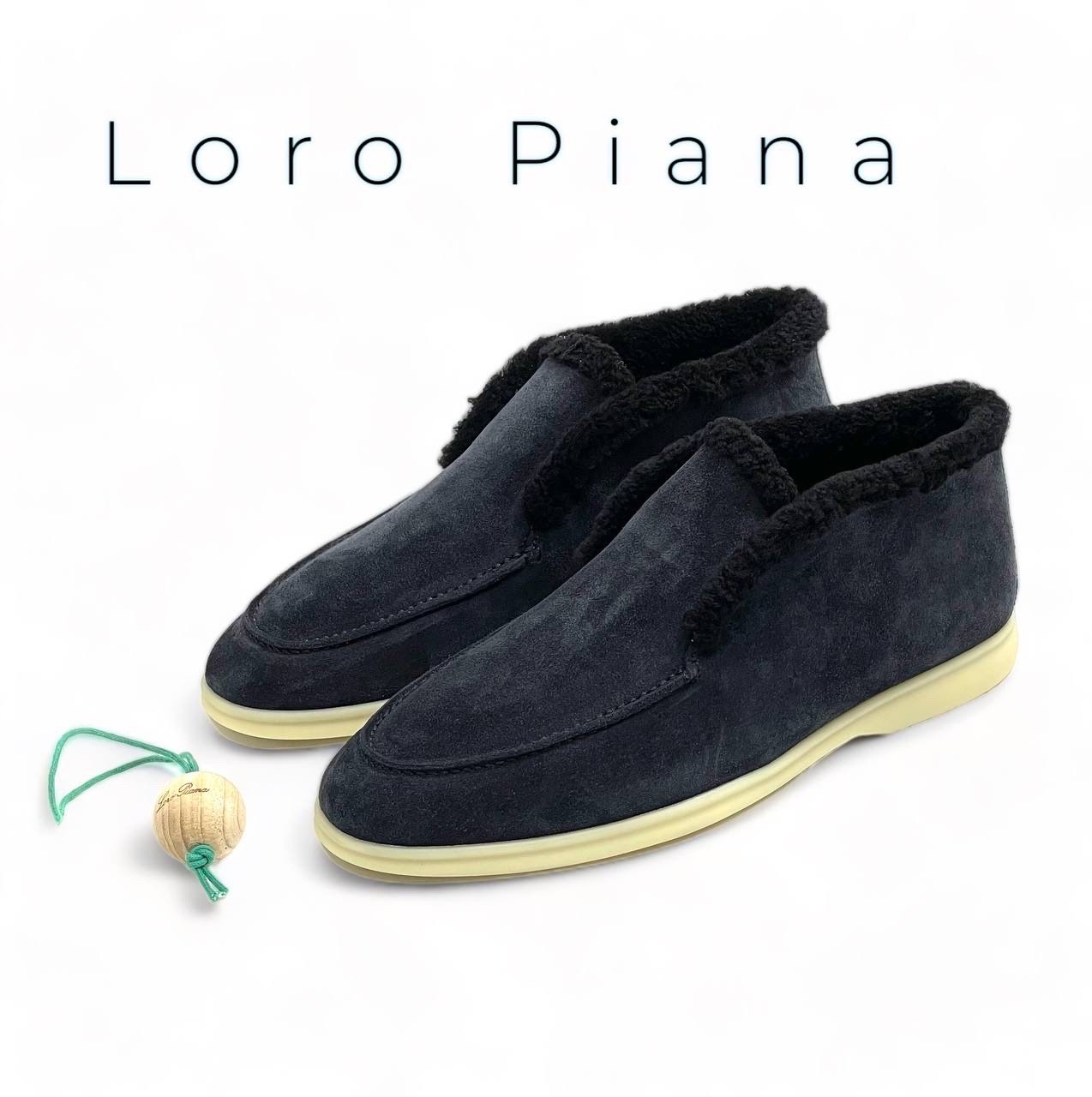 LORO PIANA лоферы высокие с мехом наружу на белой подошве синяя замша