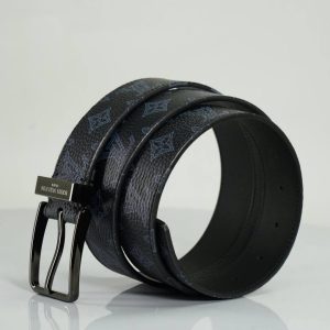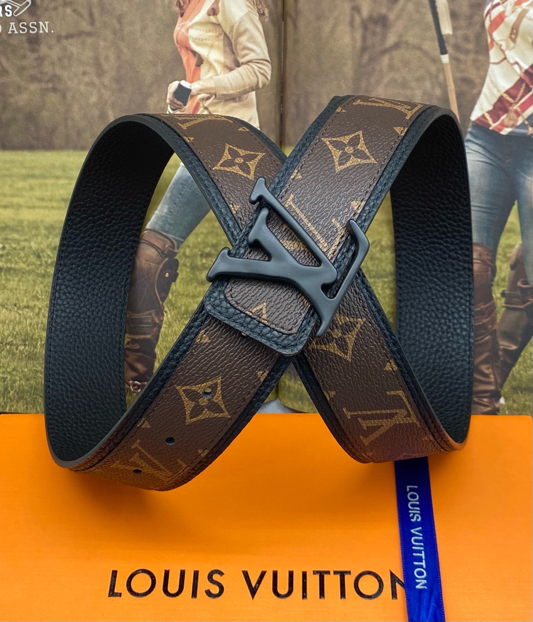 LV ремень черный того с нашивкой по всей длине в коричневую монограмму пряжка LV черная матовая
