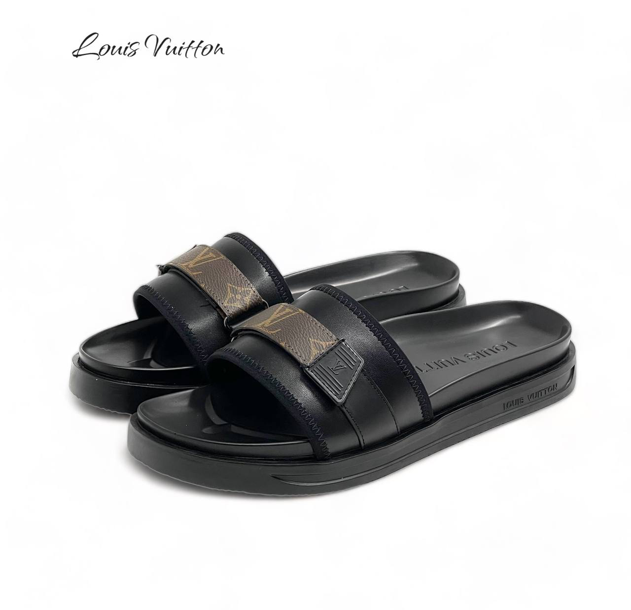 LV шлепанцы черные с коричневым ремешком, монограмма на ремешке