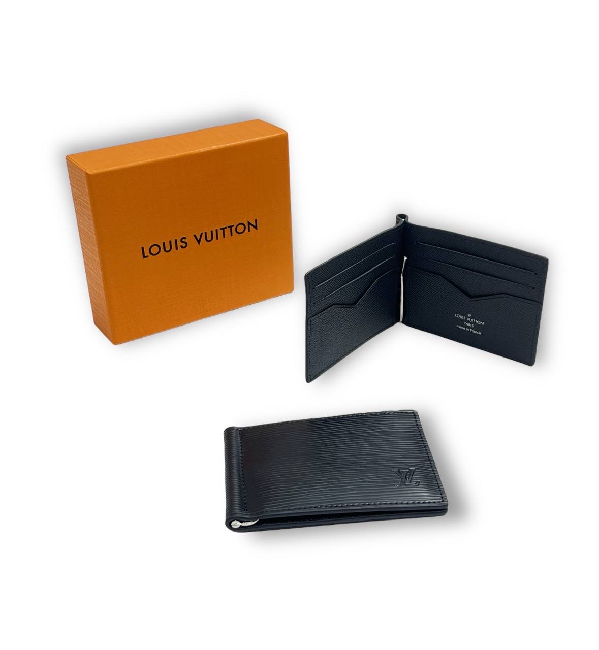 LV зажим 4 визитки черная кожа тиснение в шашку