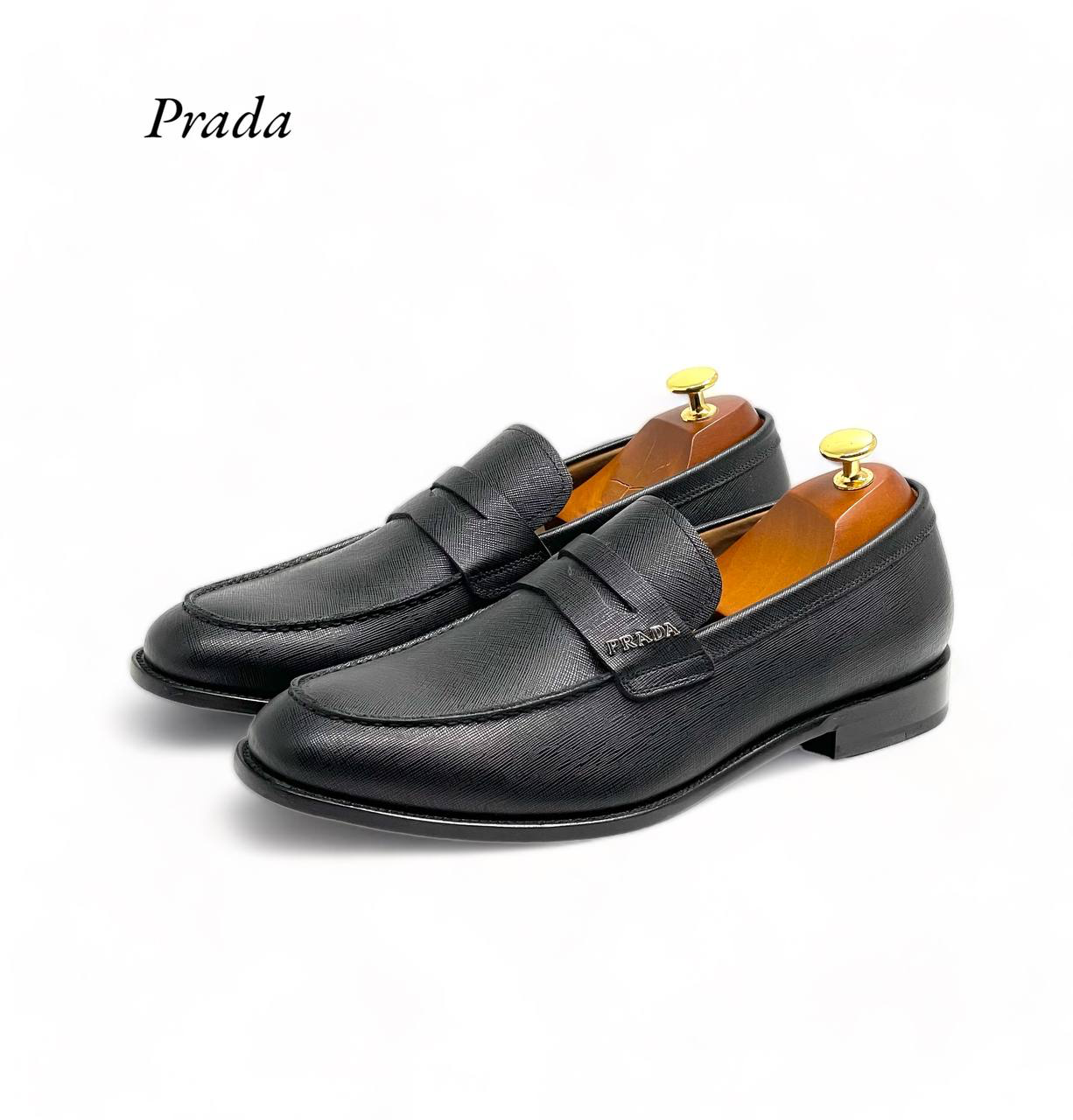 PRADA лоферы из кожи сафьяно черного цвета с металлическим лого с боку на перемычке
