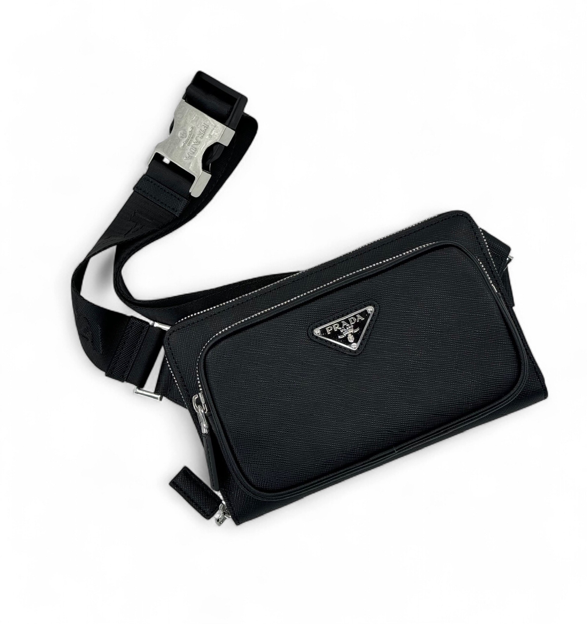 PRADA поясная сумка кожа эпсон черная с логотипом на двух молниях