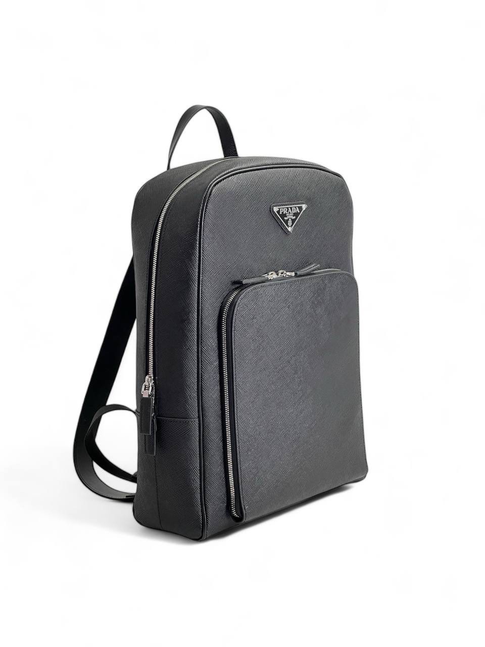 PRADA Рюкзак черный большой из кожи софьяно с карманом на молнии по центру