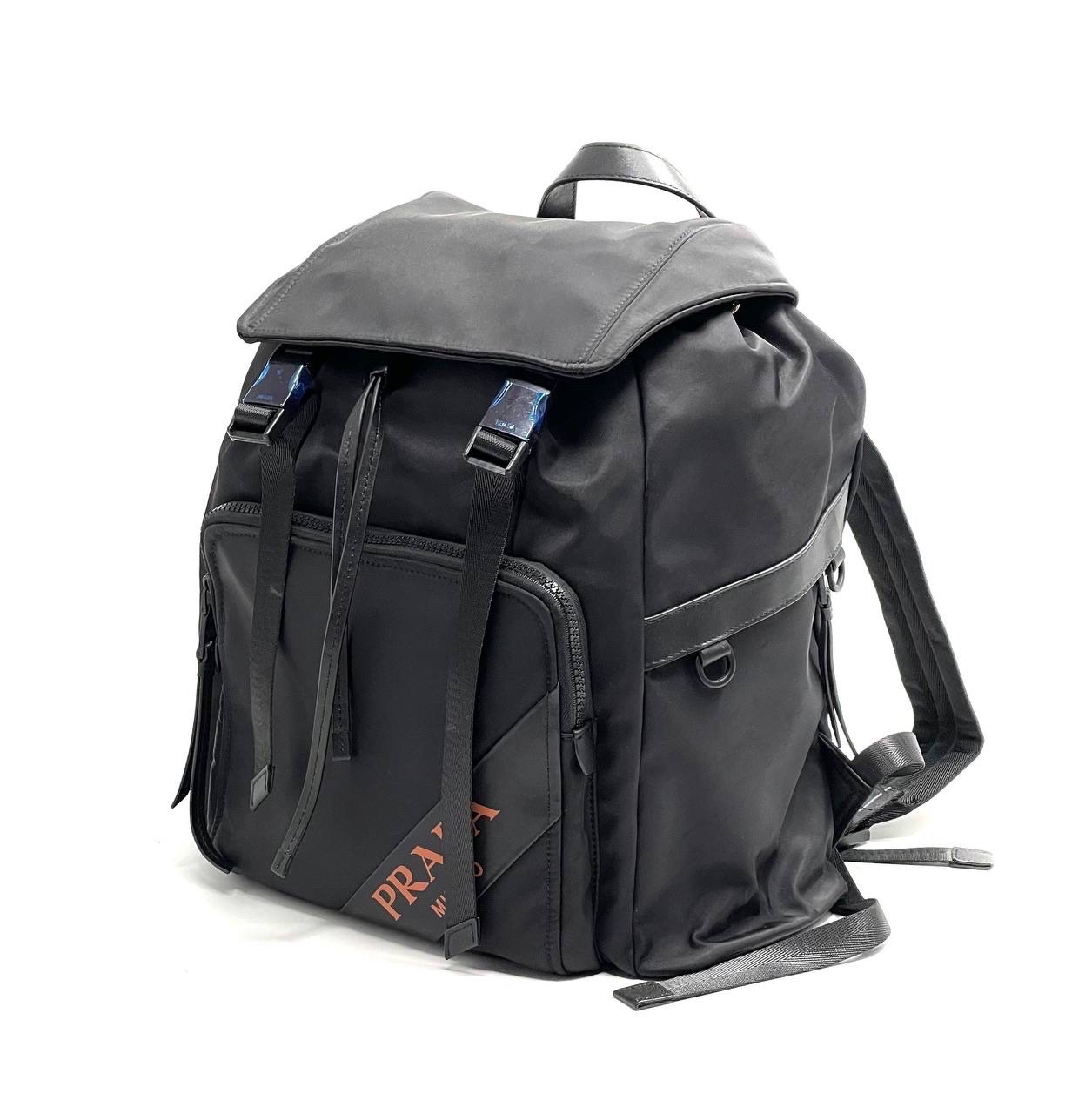 PRADA Рюкзак нейлон черный оранжевая надпись бренда в правом углу две застежки