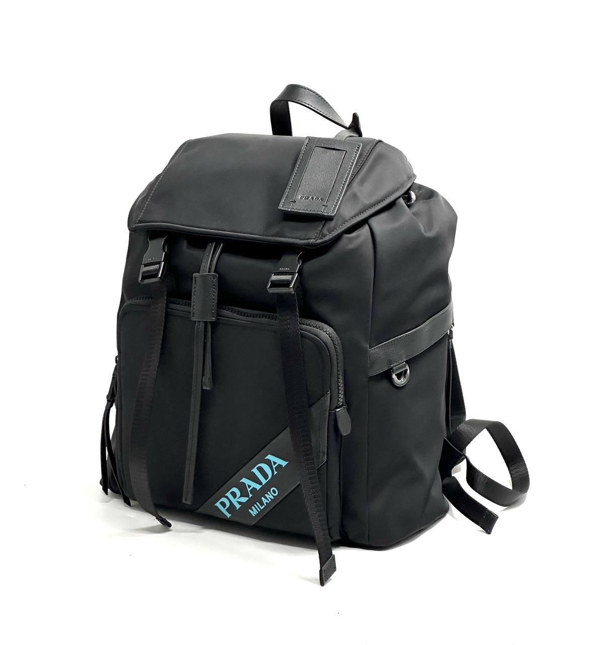 PRADA Рюкзак нейлон черный синяя надпись бренда в правом углу две застежки