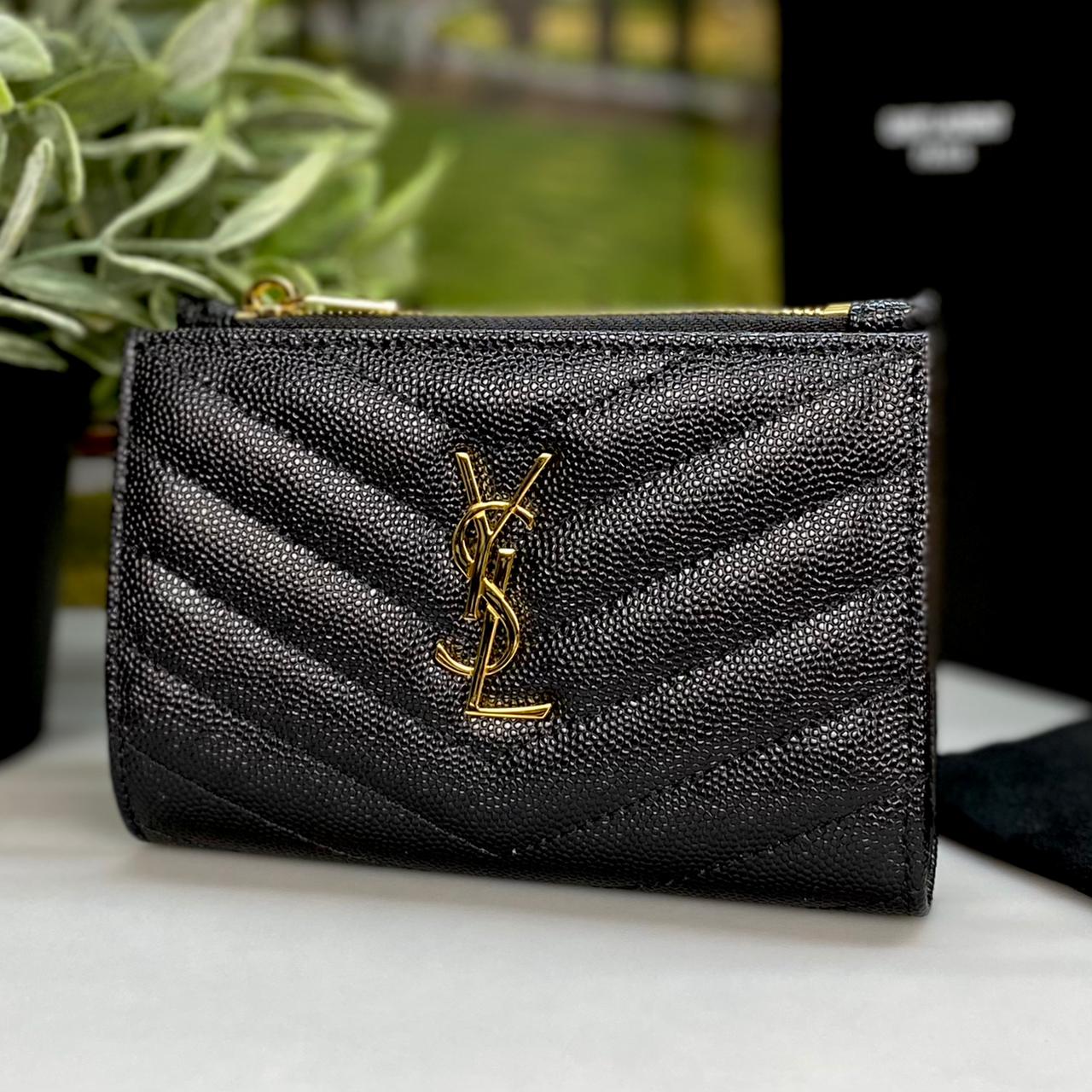 SL портмоне 8 карманов для карт с монетницей на молнии из черной кожи CAVIAR с логотипом YSL золото