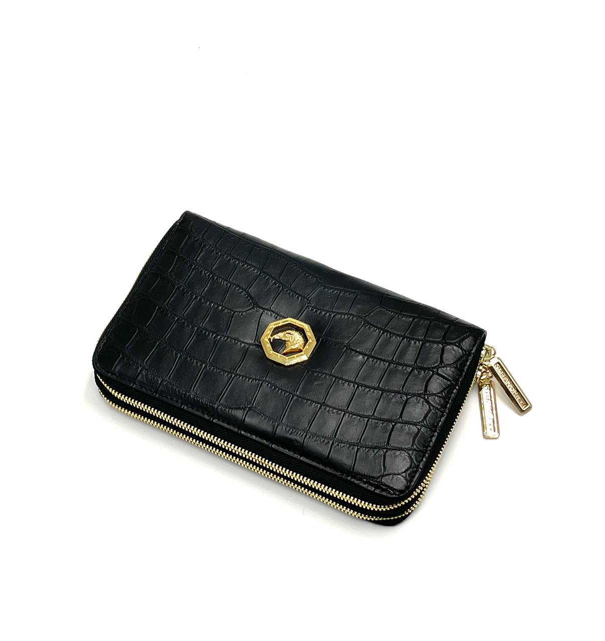 SR кошелек черный крокодил на двух молниях серебро с ручкой