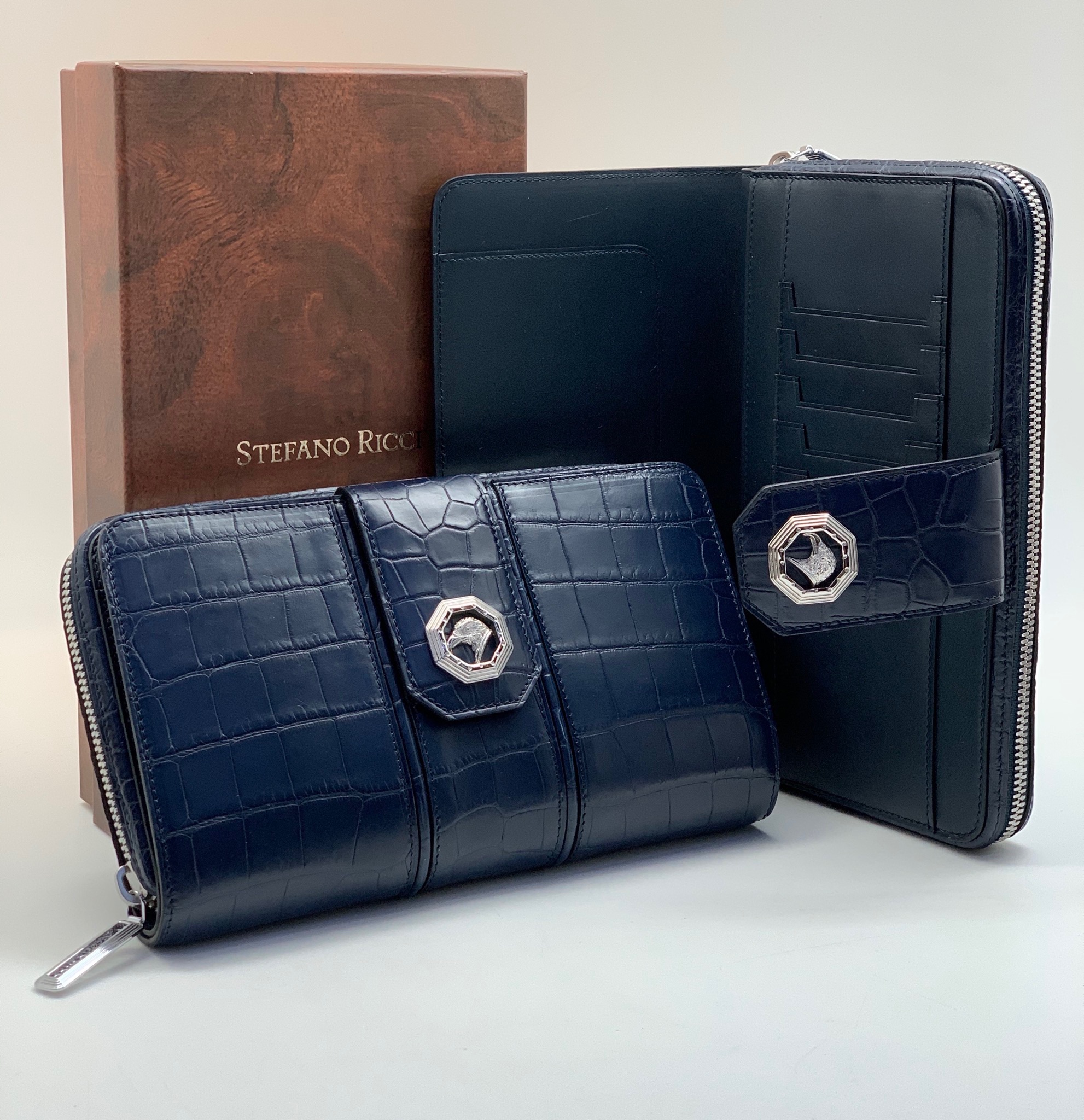 SR кошелек крокодил синий на двух молниях с ручкой сверху