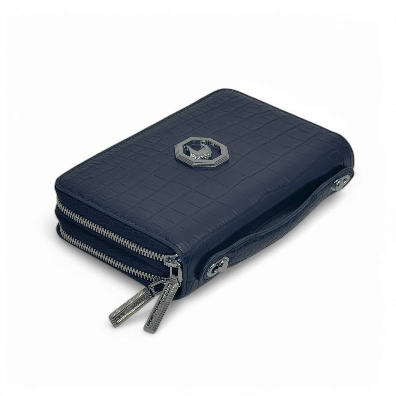 SR кошелек крокодил синий на двух молниях с ручкой сверху с новой фурнитурой серебро